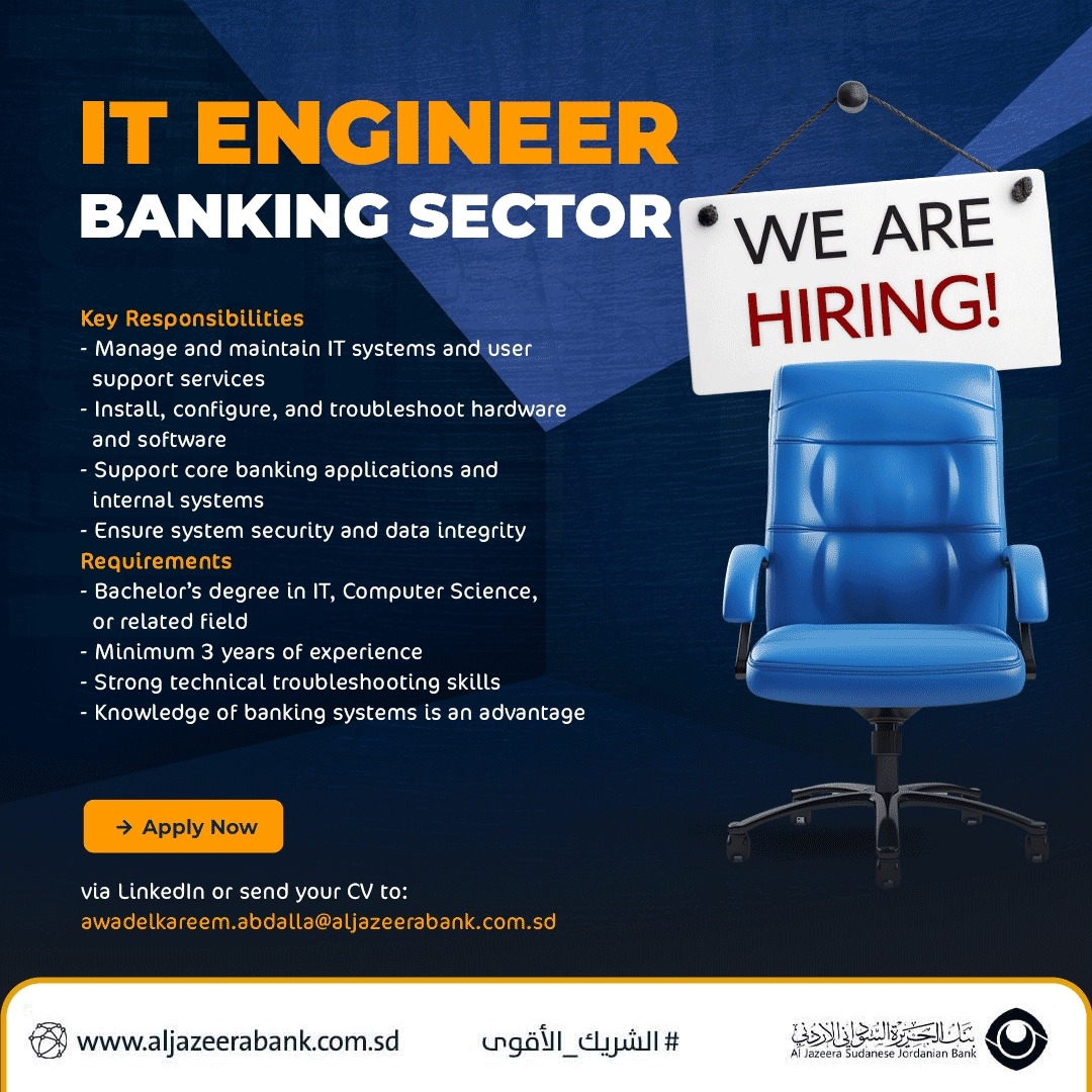 | Job Opportunity – IT Engineer (Banking Sector) A leading banking institution is seeking to hire a qualified IT Engineer to join its team Key Responsibilities: Manage and maintain IT systems and user support services Install, configure, and troubleshoot hardware and software Support core banking applications and internal systems Ensure system security and data integrity Requirements: Bachelor’s degree in IT, Computer Science, or related field Minimum 3 years of experience Strong technical troubleshooting skills Knowledge of banking systems is an advantage Apply via LinkedIn or send your CV to: Awadelkareem.abdalla@aljazeerabank.com.sd #Aljazeerabank #sudan #job | منذ 7 ساعات | تحميل | عرض | قدم الآن |